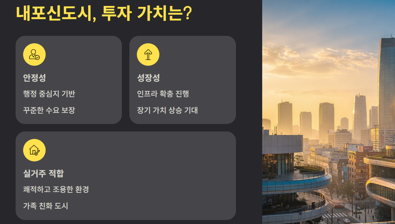 내포신도시는 이제 막 성장을 시작한 도시이지만 행정 중심지라는 안정성을 기반으로 꾸준히 개발되고 있습니다. 조용하고 쾌적한 환경을 선호하는 실거주자에게 적합하며, 장기적발전 가능성도 충분합니다. 앞으로의 교통 인프라 확충과 상업시설 확대가 이루어진다면 내포신도시는 충남 권역에서 더욱 중요한 거점 도시로 자리 잡을 전망입니다.