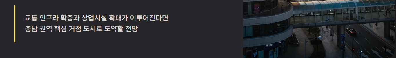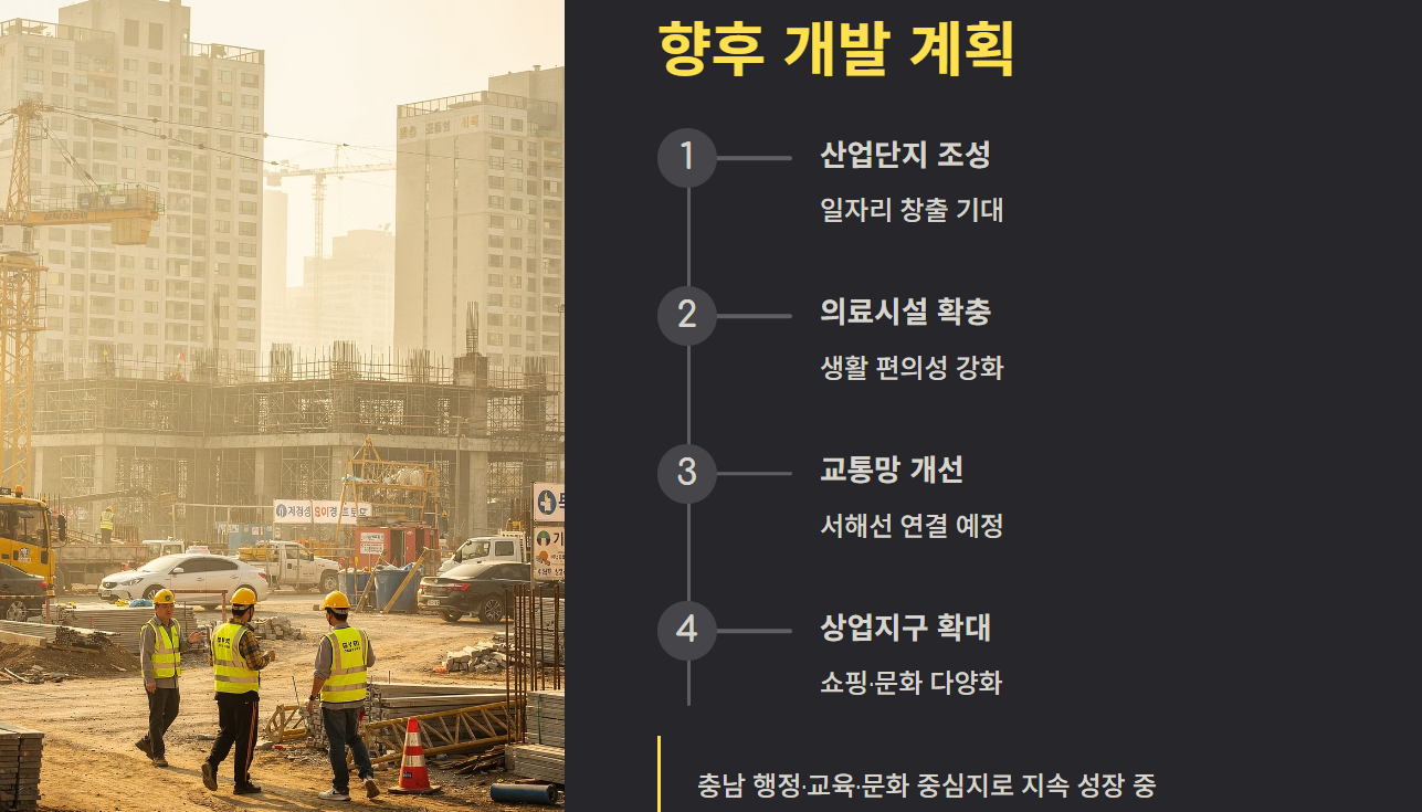 충남도는 내포신도시를 충남의 행정·교육·문화 중심지로 키우기 위한 지속적 개발을 진행 중입니다. 산업단지 조성, 의료시설 확충, 교통망 개선 등이 포함되어 있어 장기적 가치 상승 기대가 있습니다.
