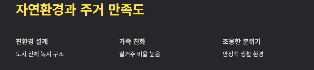 도시 전체가 친환경 구조로 설계돼 있으며, 중심공원과 산책 인프라가 잘 마련되어 있습니다. 가족 단위 실거주 비율이 높아 상대적으로 조용하고 안정적인 도시 분위기를 가지고 있습니다.