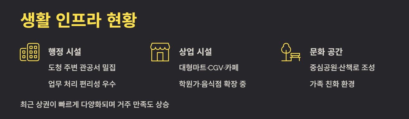 도청 주변을 중심으로 관공서, 스타벅스, CGV, 대형마트 등이 들어서 있으며, 최근에는 학원가와 음식점 상권도 빠르게 확장되고 있습니다. 기존에 부족하다고 여겨지던 상업시설도 점차 다양해져 거주 만족도가 높아지고 있습니다.