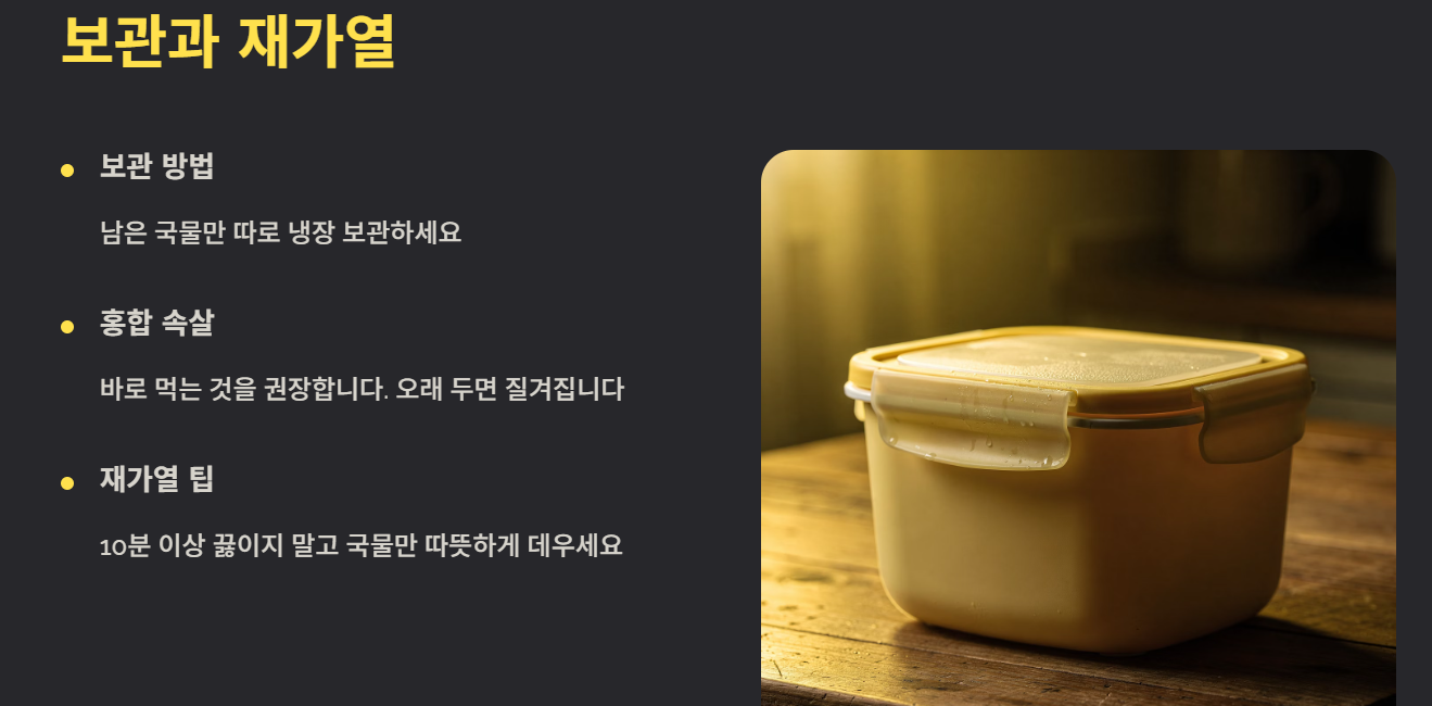 7️⃣ 홍합탕 보관 방법과 재가열 팁