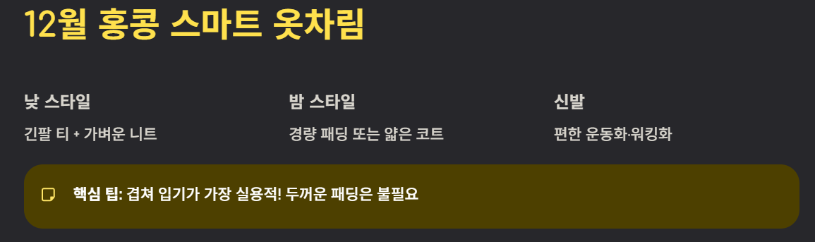 12월 홍콩 여행 시 추천 옷차림은 다음과 같습니다.