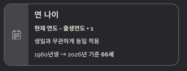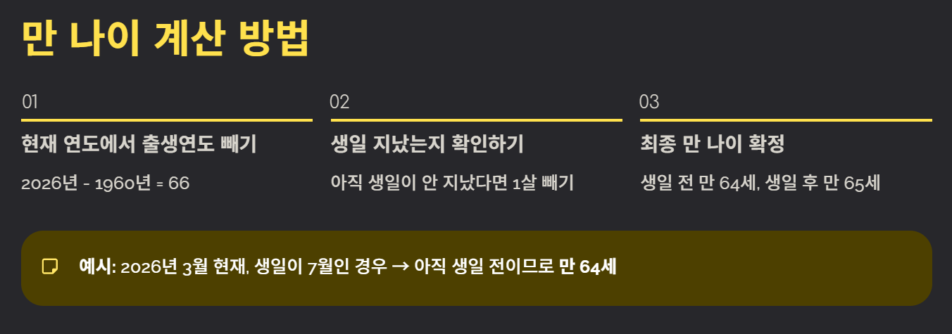 예) 2026년 3월, 생일이 7월인 경우 → 2026 – 1960 = 66 → 생일 전이므로 만 65세