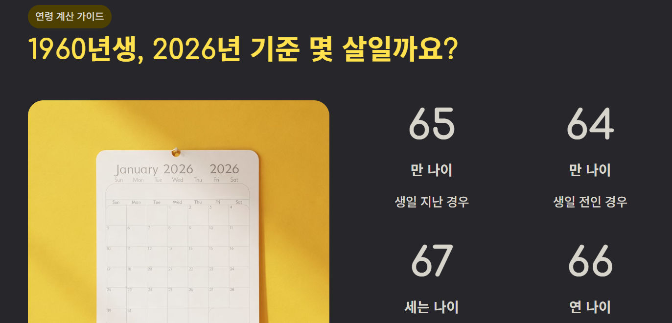 1960년생의 경우 2026년 기준 세는 나이 67세, 연 나이 66세로 계산됩니다.