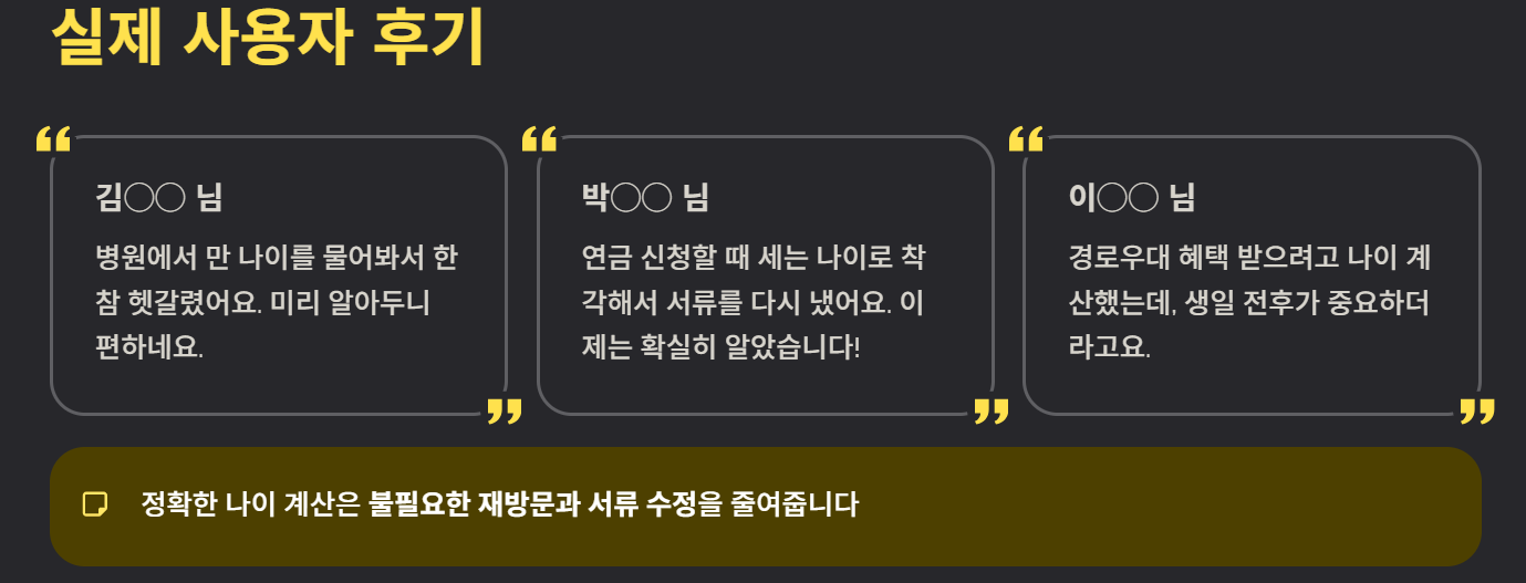 실제 후기들을 보면 “병원에서 만 나이를 물어봐 헷갈렸다”, “연금 신청할 때 세는 나이로 착각해 서류를 다시 냈다”는 사례가 많습니다. 미리 정확한 나이를 알아두면 불필요한 재방문, 서류 수정을 줄일 수 있어 편리하다는 의견이 많습니다.