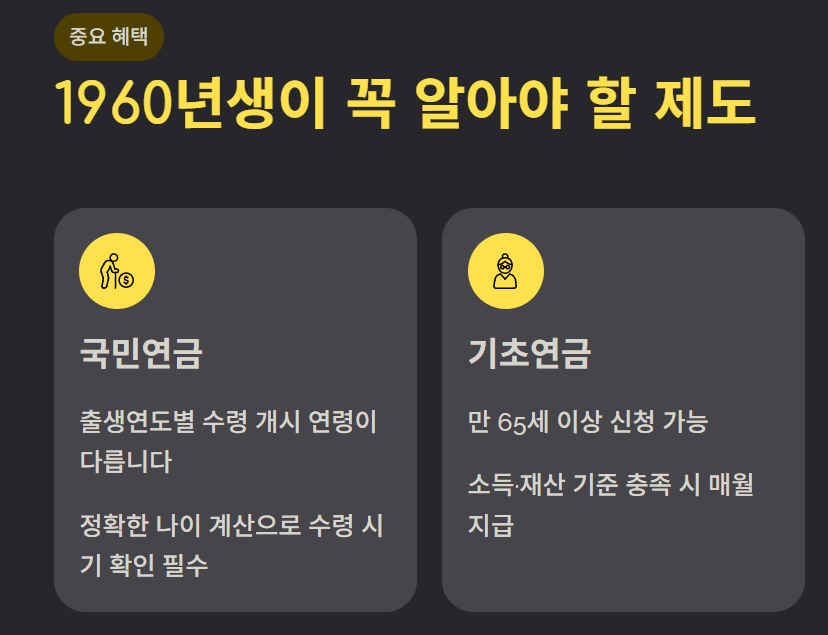 - 국민연금: 출생연도별 수령 개시 연령 확인 필요