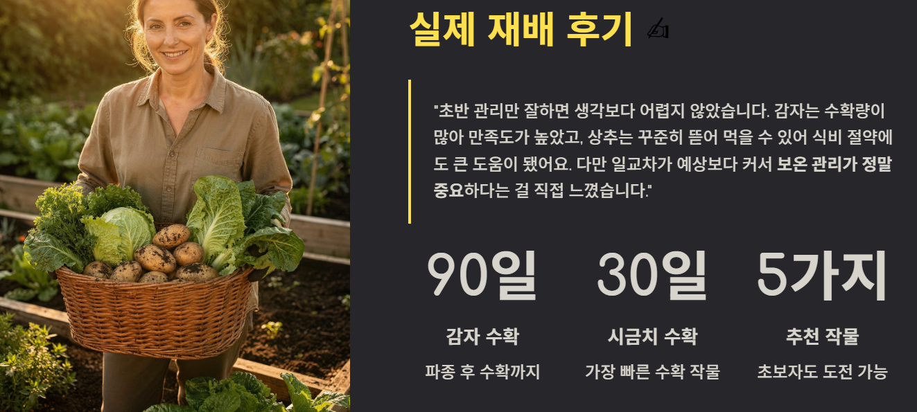 직접 3월에 감자와 상추를 재배해본 결과, 초반 관리만 잘하면 크게 어렵지 않았습니다. 특히 감자는 수확량이 많아 만족도가 높았고, 상추는 꾸준히 수확할 수 있어 식비 절약에도 도움이 되었습니다. 다만 예상보다 일교차가 커서 초기에는 보온 관리가 매우 중요하다는 점을 느꼈습니다.