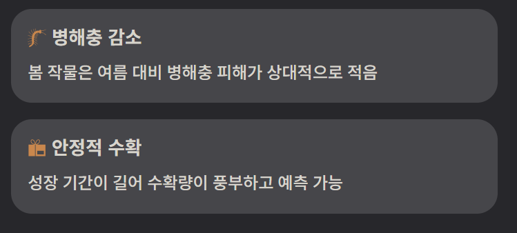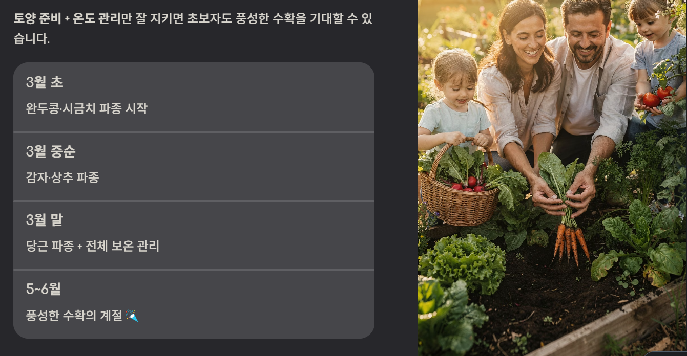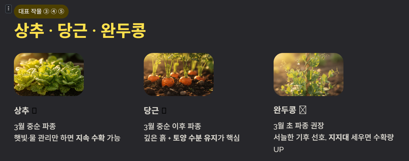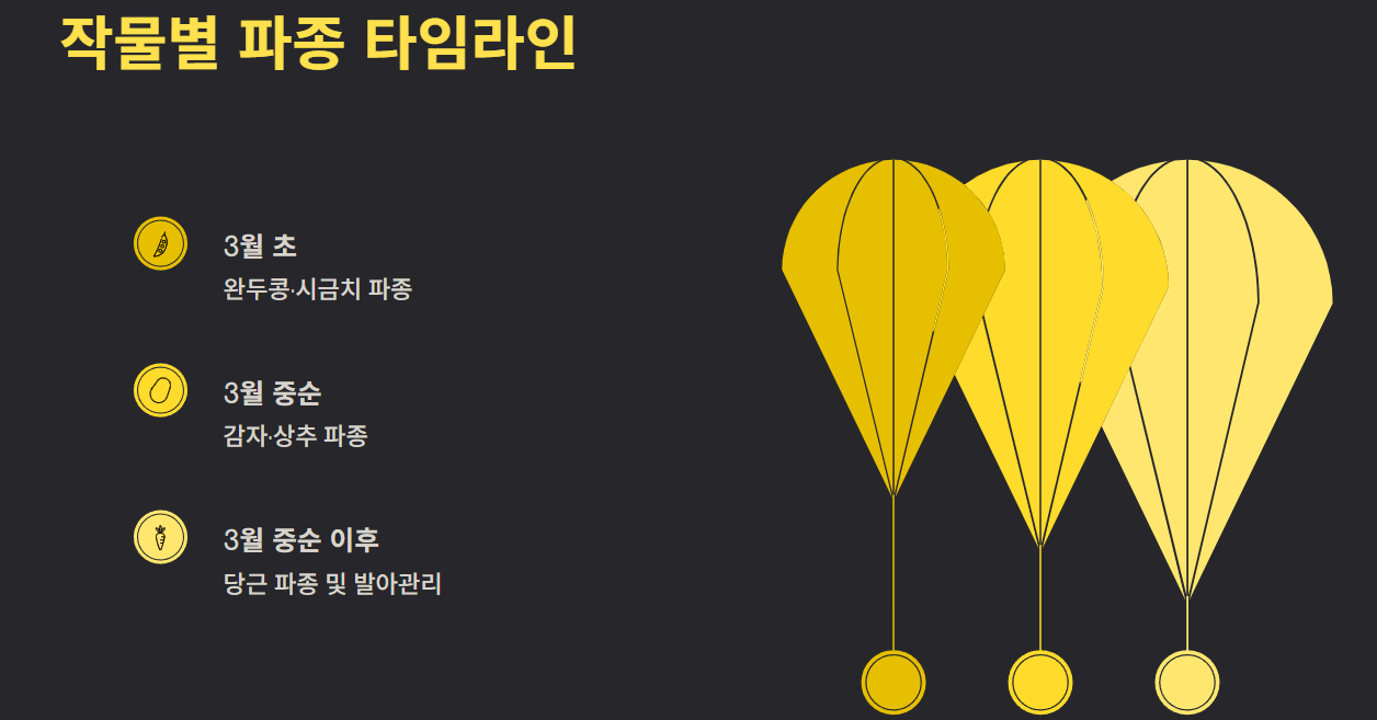 3월은 토양 온도가 서서히 올라가 씨앗 발아에 적합한 환경이 만들어집니다. 또한 봄 작물은 성장 기간이 길어 수확량이 안정적이며 병해충 피해도 상대적으로 적습니다.
