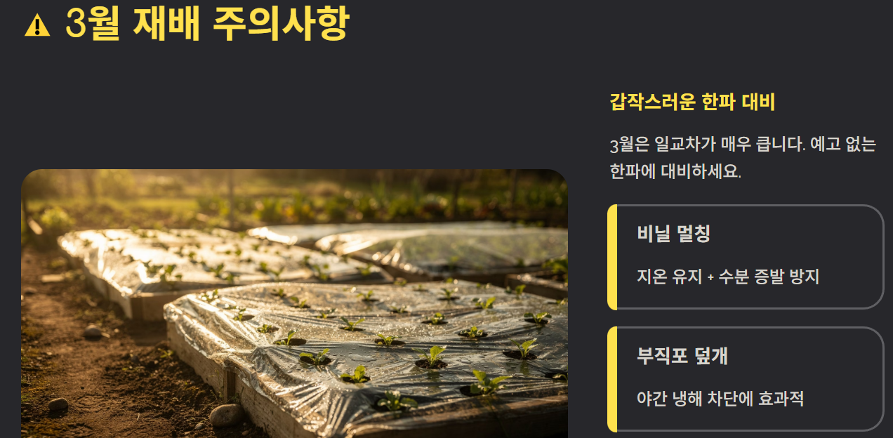 3월은 갑작스러운 한파가 올 수 있기 때문에 비닐 멀칭이나 부직포 덮개를 활용해 작물을 보호해야 합니다. 물은 과습하지 않도록 주의해야 합니다.