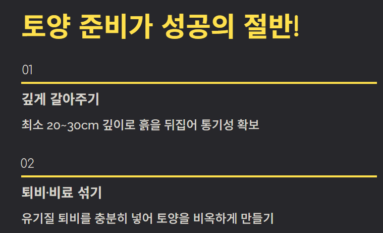 작물을 심기 전 퇴비와 비료를 충분히 섞어 토양을 비옥하게 만들어야 합니다. 또한 배수와 통기성을 확보하는 것이 중요합니다.