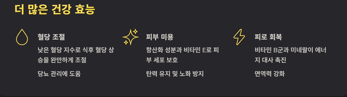 비타민 B군과 미네랄이 풍부해 에너지 대사를 돕고 피로 회복에 효과적입니다. 면역력 강화에도 도움을 줘 환절기 건강 관리 식품으로 좋습니다.