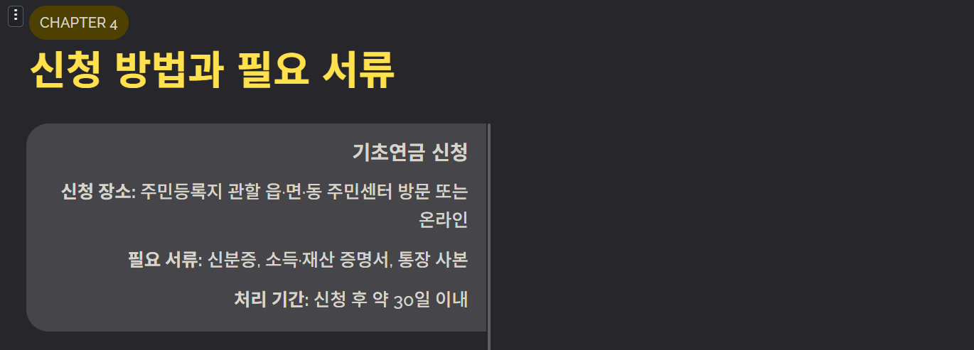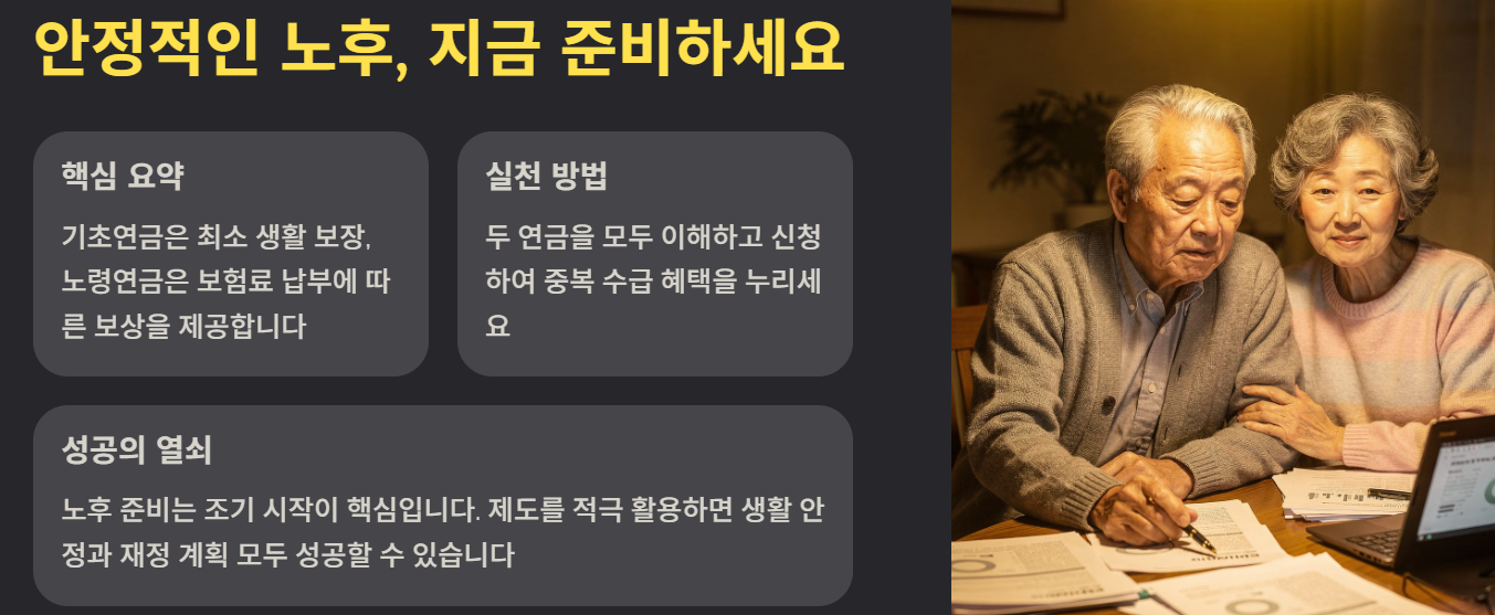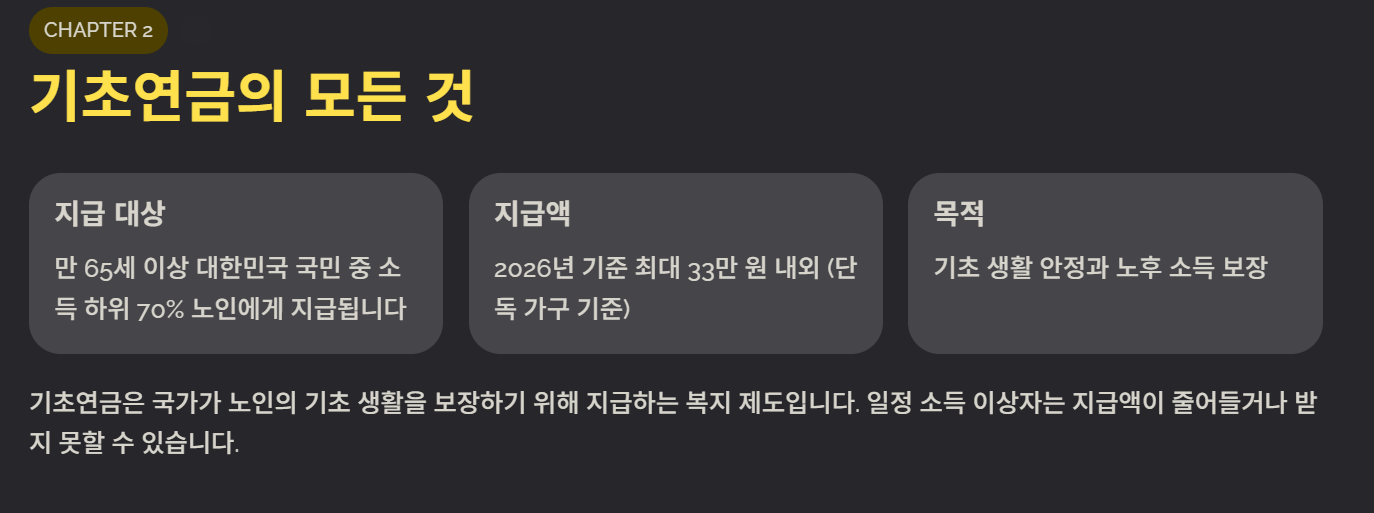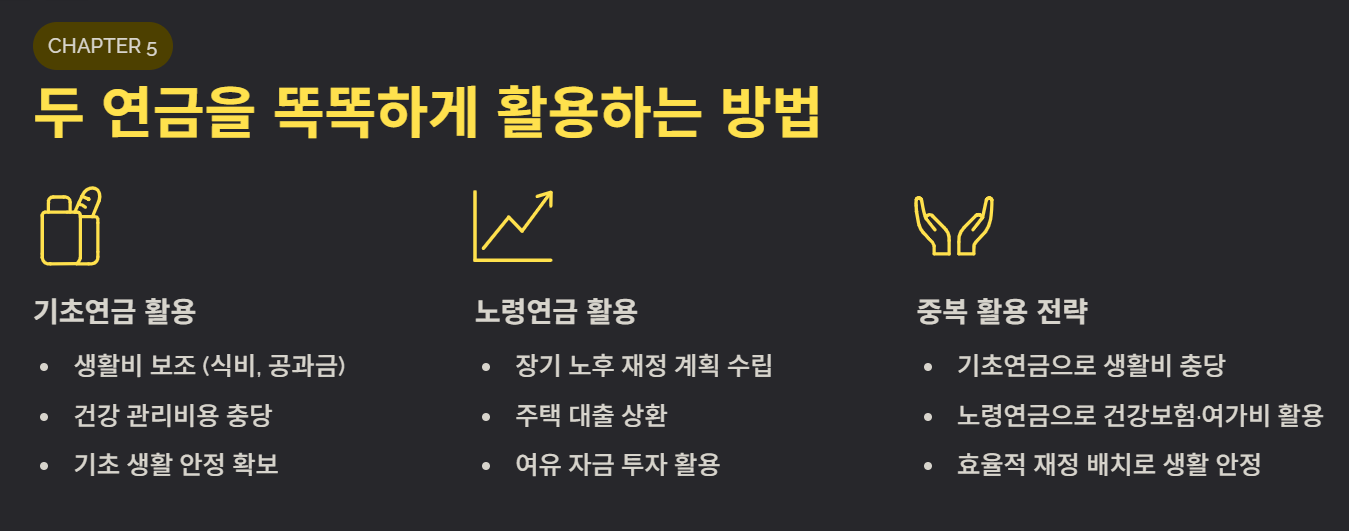 - 기초연금: 생활비 보조, 건강 관리비용 활용