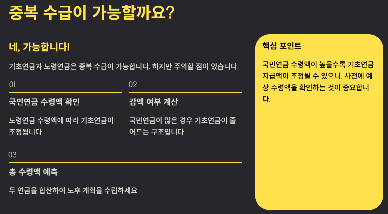 기초연금과 노령연금은 중복 수급 가능합니다. 단, 기초연금은 노령연금 수령액에 따라 일부 조정될 수 있습니다. 즉, 국민연금이 많은 경우 기초연금이 줄어드는 구조입니다.