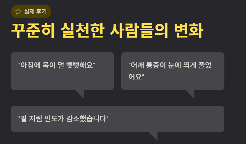 목디스크 운동을 꾸준히 실천한 사람들의 후기를 보면, “아침에 목이 덜 뻣뻣하다”, “어깨 통증이 눈에 띄게 줄었다”, “팔 저림 빈도가 감소했다”는 반응이 많습니다.