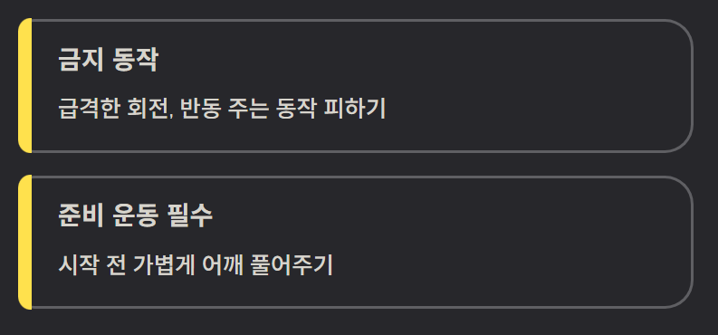목디스크 운동은 통증이 없는 범위에서 진행해야 합니다. 통증이 심하거나 팔 저림이 악화된다면 즉시 중단해야 하며, 급격한 회전이나 반동을 주는 동작은 피하는 것이 좋습니다. 운동 전 가볍게 어깨를 풀어주는 준비 운동도 필수입니다.