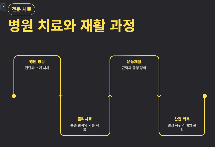 통증이 심하거나 부기가 지속된다면 정형외과 진료가 필요합니다. 물리치료, 보조기 착용, 심한 경우 깁스나 수술을 시행하기도 합니다. 이후에는 스트레칭과 근력 강화 재활 운동이 필수입니다.