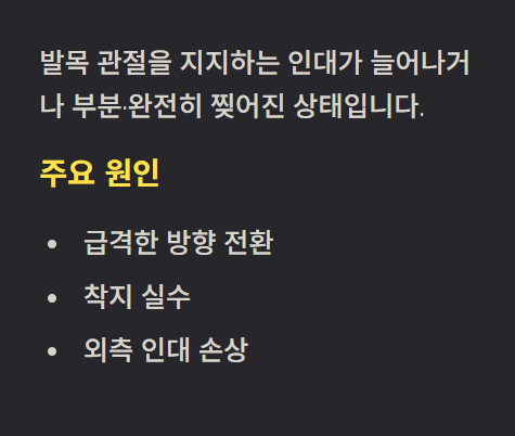 발목인대파열은 발목 관절을 지지하는 인대가 늘어나거나 부분 혹은 완전히 찢어진 상태를 말합니다. 주로 외측 인대가 손상되며, 급격한 방향 전환이나 착지 실수로 발생합니다.
