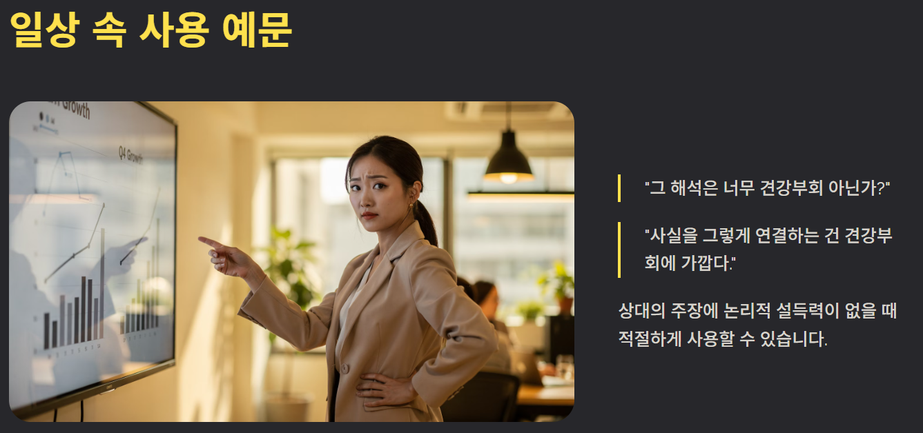 이때 “그건 견강부회다”라고 표현하면 논리적 결함을 지적하는 말이 됩니다.