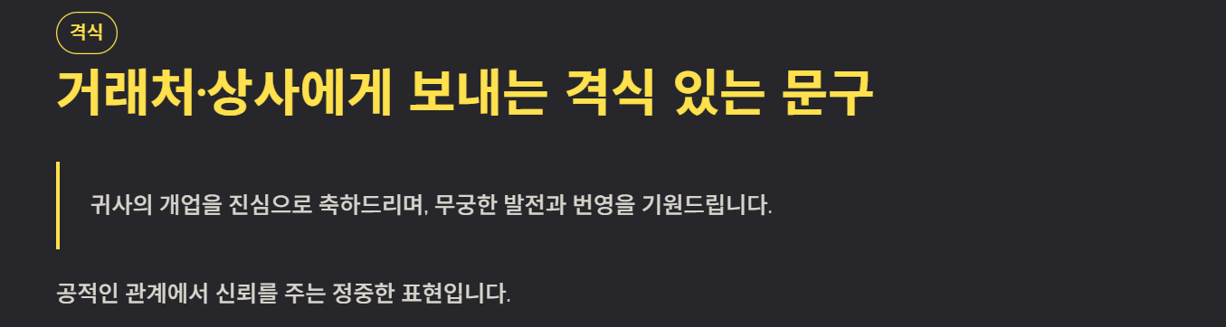 “귀사의 개업을 진심으로 축하드리며, 무궁한 발전과 번영을 기원드립니다.”