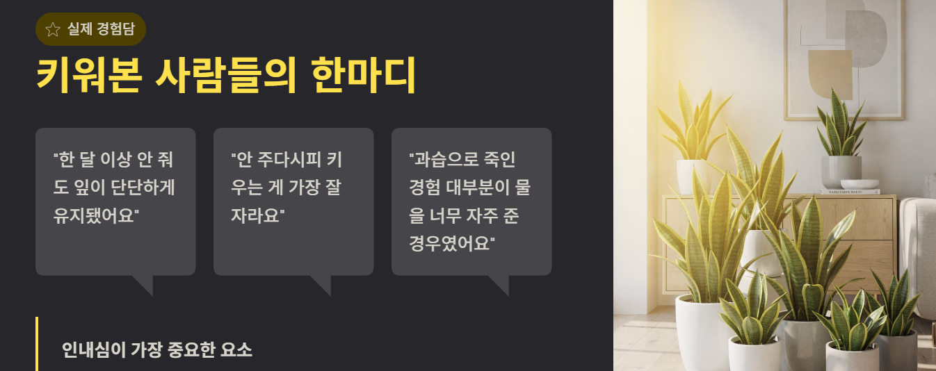 산세베리아를 오래 키운 사람들의 공통된 후기는 “안 주다시피 키우는 게 가장 잘 큰다”는 것이다. 한 달 이상 물을 주지 않아도 잎이 단단하게 유지됐다는 경험담이 많으며, 과습으로 죽였다는 후기 역시 대부분 물을 너무 자주 준 경우였다. 산세베리아 물주기는 인내심이 가장 중요한 요소라는 평가가 많다.