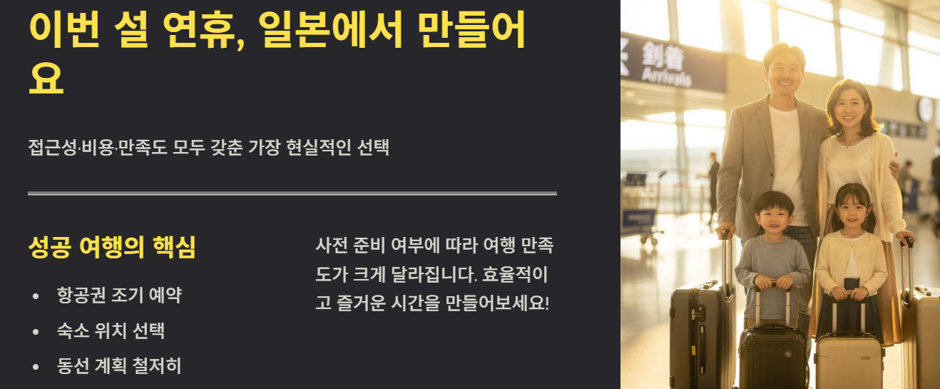 설날 일본 여행은 접근성, 비용, 만족도를 모두 고려했을 때 가장 현실적인 해외여행 선택지입니다. 항공권 조기 예약, 숙소 위치 선택, 동선 계획만 잘 세우면 짧은 연휴에도 충분히 알찬 여행이 가능합니다. 실제 후기에서도 준비 여부에 따라 만족도가 크게 달라지는 만큼 사전 조사와 예약이 가장 중요한 포인트입니다. 올해 설 연휴에는 일본 여행을 계획해 효율적이고 즐거운 시간을 만들어보시기 바랍니다.