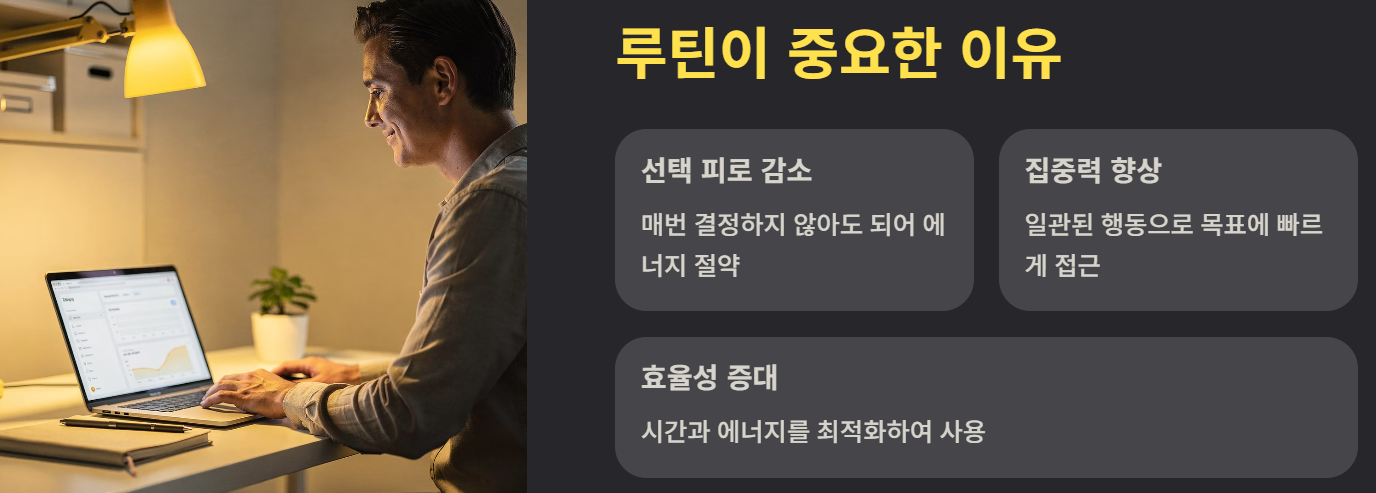 루틴을 만들면 선택 피로가 줄어들고 집중력이 향상됩니다. 매번 결정을 내리지 않아도 되기 때문에 에너지 소모가 줄어들고 목표에 더 빠르게 접근할 수 있습니다.