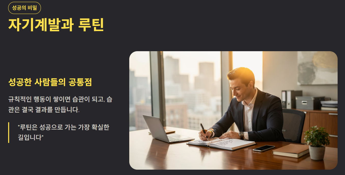 성공한 사람들은 대부분 자신만의 루틴을 가지고 있습니다. 규칙적인 행동이 쌓이면 습관이 되고, 습관은 결국 결과를 만들어냅니다.