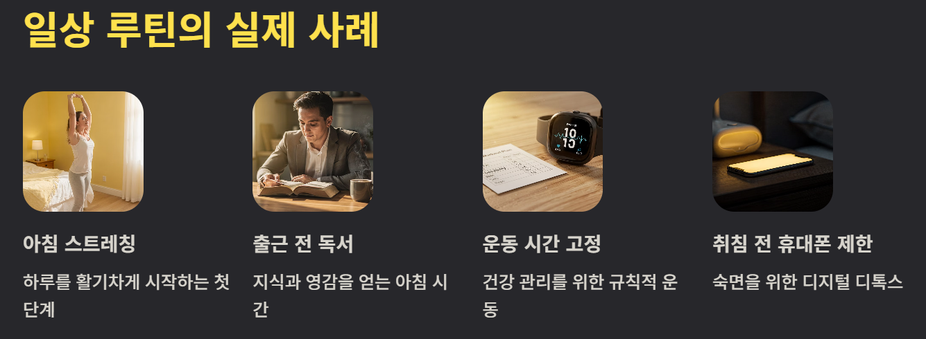 루틴을 실천한 사람들의 후기를 보면 가장 큰 변화는 “생활이 안정되고 목표 달성이 쉬워졌다”는 점입니다. 특히 아침 루틴을 만든 사람들은 집중력 향상과 시간 관리 능력이 크게 좋아졌다는 평가가 많습니다.