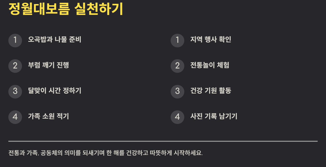 먼저 오곡과 나물을 미리 준비한다. 이후 가족이 함께 달맞이를 계획하고 지역 행사 참여 여부를 확인한다. 아이들과 함께 부럼 깨기나 소원 적기 활동을 하면 교육 효과도 높다.