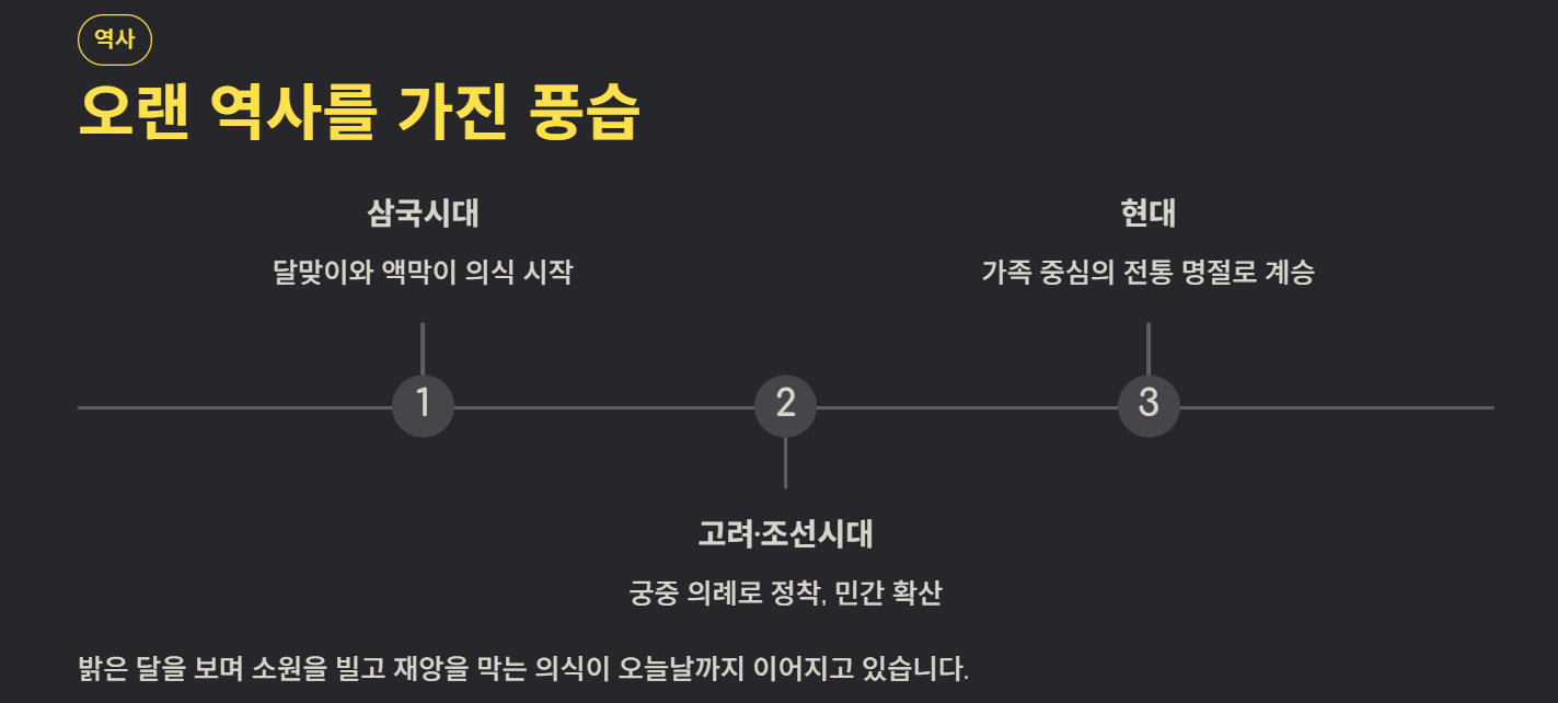 삼국시대부터 이어진 풍습으로 알려져 있으며 달맞이와 액막이 의식이 중심이었다. 예로부터 사람들은 밝은 달을 보며 소원을 빌고 재앙을 막는 의식을 진행했다.