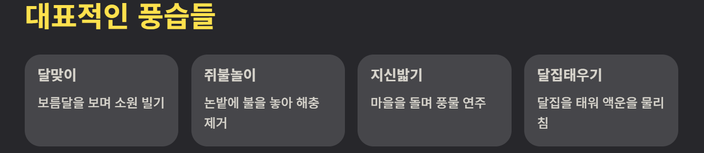 대표 풍습으로는 달맞이, 쥐불놀이, 지신밟기, 부럼 깨기 등이 있다. 이러한 활동은 공동체 결속을 강화하고 액운을 물리치는 의미를 가진다.