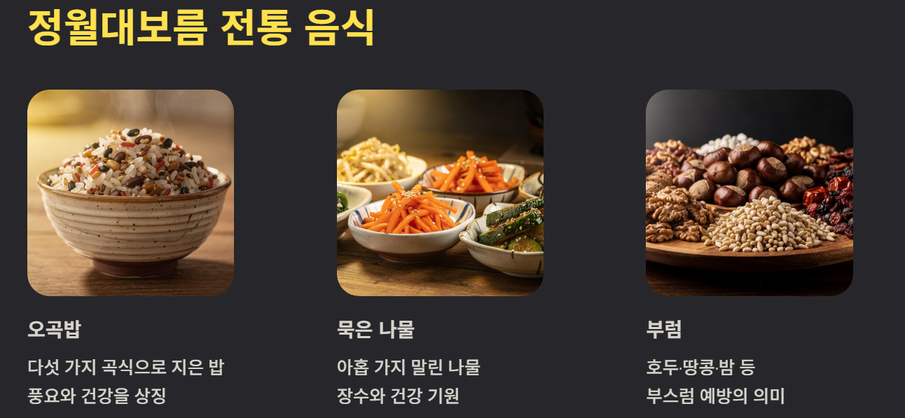 대표 음식은 오곡밥과 나물이다. 다양한 곡식을 섞어 지은 밥은 풍요를 상징하고 묵은 나물은 건강과 장수를 의미한다. 부럼 깨기는 한 해 동안 부스럼이 나지 않기를 바라는 풍습이다.