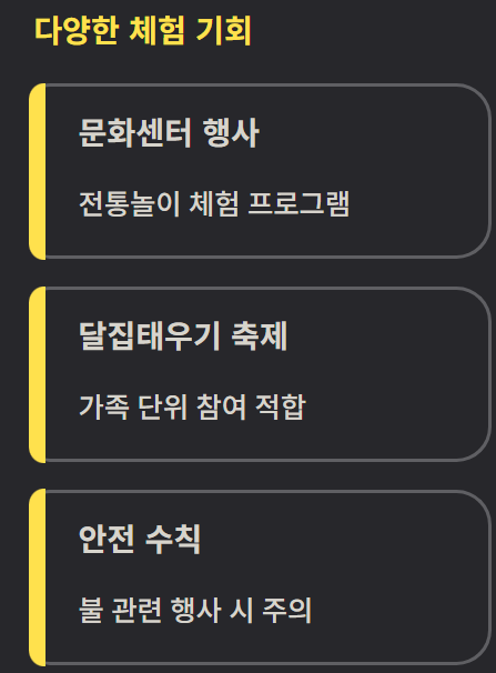 지역 문화센터나 축제를 확인하면 다양한 체험이 가능하다. 달집태우기 행사나 전통놀이 체험은 가족 단위 참여에 적합하다. 안전수칙을 지키는 것이 중요하다.