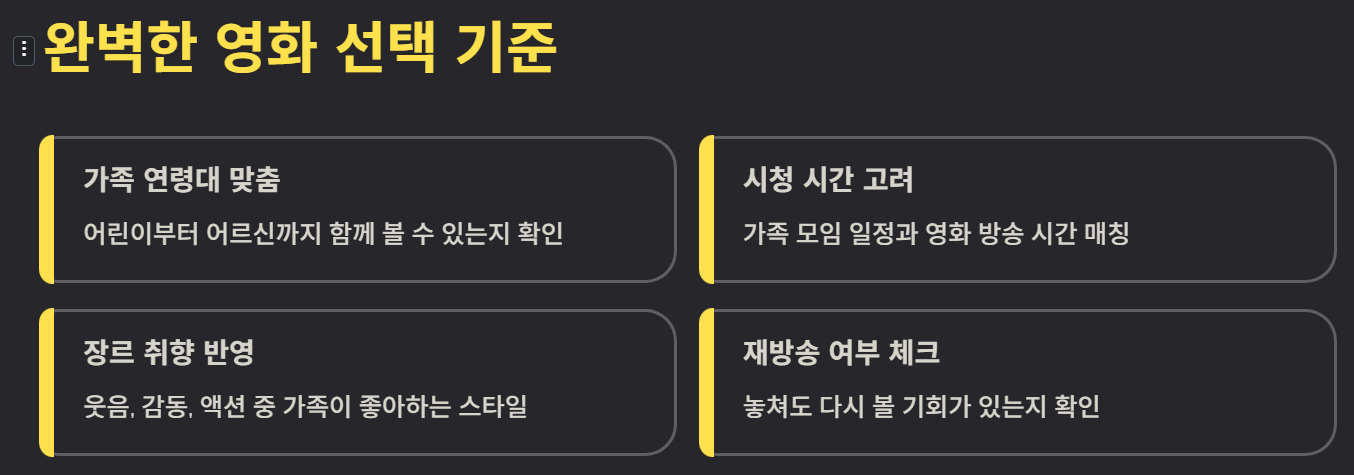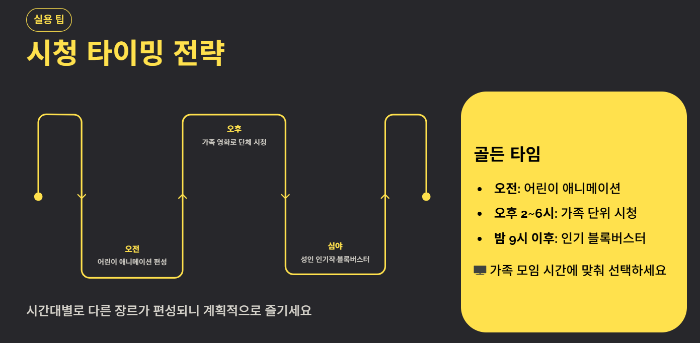 연휴 기간에는 오전·오후·심야 시간대별로 영화가 다르게 편성됩니다. 가족 시청은 오후 시간, 인기 영화는 밤 시간대에 많이 배치됩니다.