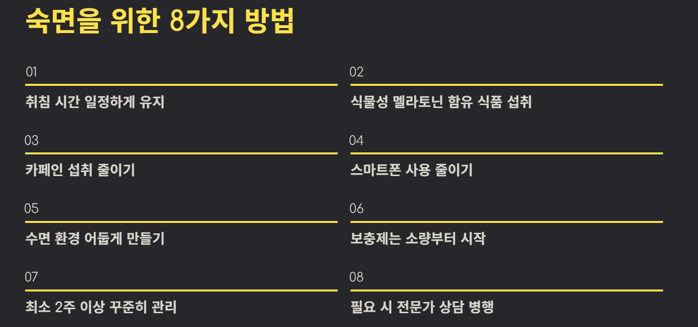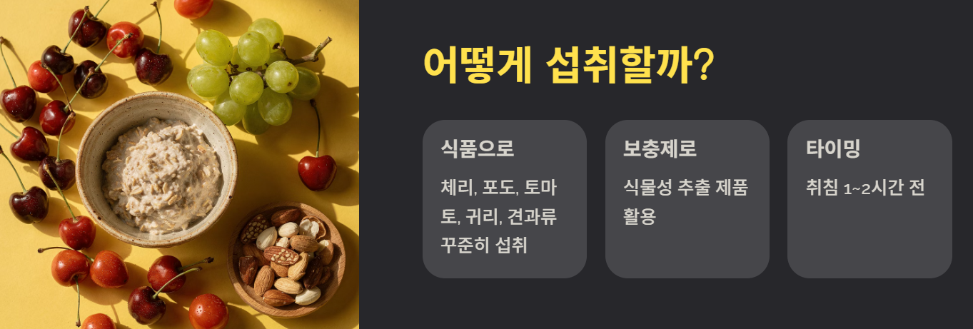 체리, 포도, 토마토, 귀리, 견과류 등 멜라토닌 함유 식품을 꾸준히 섭취하거나 식물성 보충제를 활용하는 방법이 있습니다. 취침 1~2시간 전 섭취가 일반적입니다.