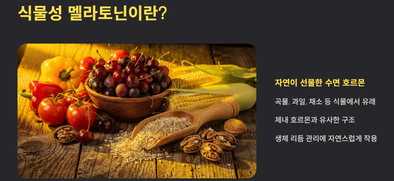 식물성 멜라토닌은 곡물, 과일, 채소 등 식물에서 유래한 멜라토닌 성분을 의미합니다. 체내 호르몬과 구조가 유사하여 수면 리듬 관리에 도움을 줄 수 있는 것이 특징입니다.