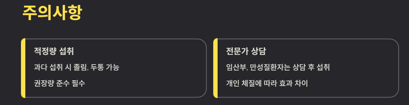 과다 섭취는 졸림, 두통 등의 증상을 유발할 수 있어 권장량을 지키는 것이 중요합니다. 임산부나 만성질환자는 전문가 상담 후 섭취하는 것이 안전합니다.