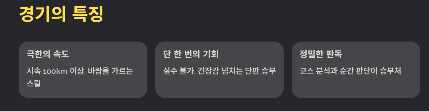 속도는 시속 100km 이상까지 올라가며, 단 한 번의 실수도 기록에 큰 영향을 줍니다. 단판 승부라는 긴장감도 특징입니다.