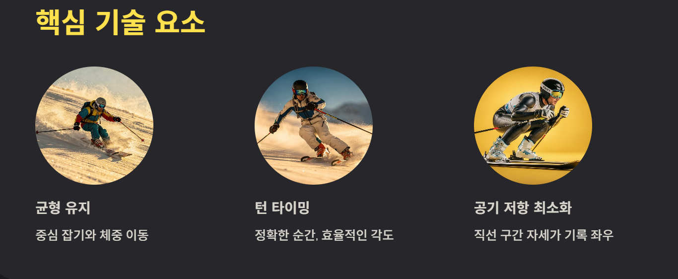 균형 유지, 체중 이동, 턴 타이밍, 공기 저항 최소화 자세가 핵심입니다. 특히 직선 구간에서 자세가 기록을 좌우합니다.
