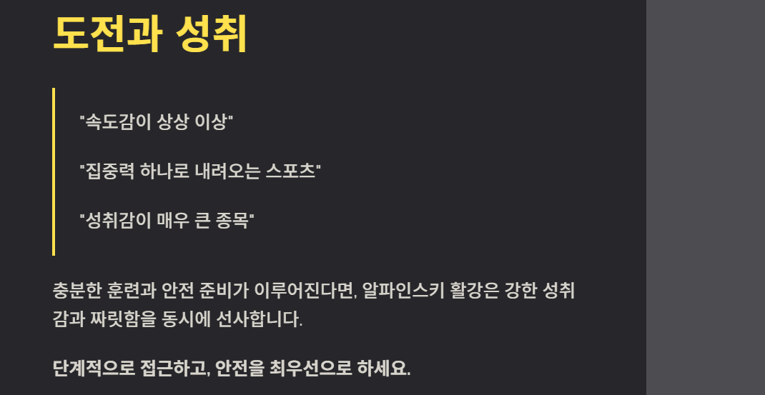 알파인스키 활강은 스피드와 기술, 집중력이 결합된 겨울 스포츠의 대표 종목입니다. 충분한 훈련과 안전 장비 준비가 이루어진다면 강한 성취감과 짜릿함을 동시에 경험할 수 있습니다.