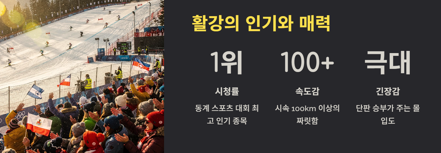 동계 스포츠 대회에서 가장 시청률이 높은 종목 중 하나이며, 스피드와 긴장감이 큰 매력입니다.