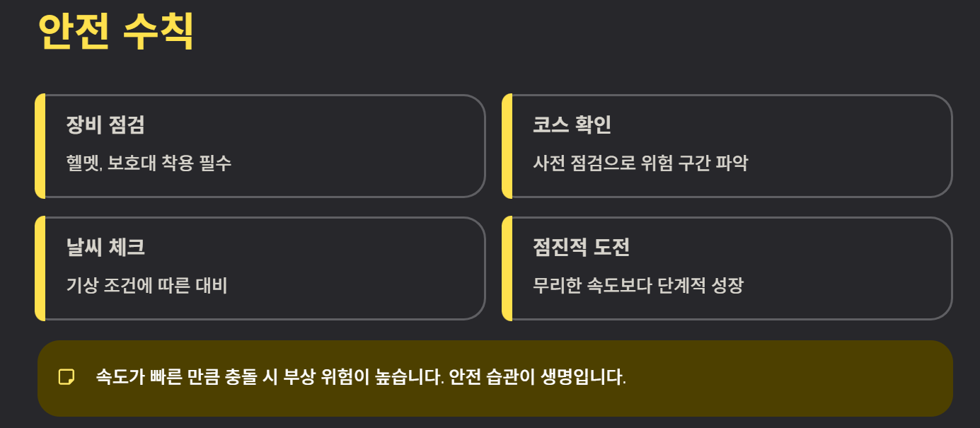 헬멧·보호대 착용, 코스 사전 확인, 날씨 체크를 습관화합니다.