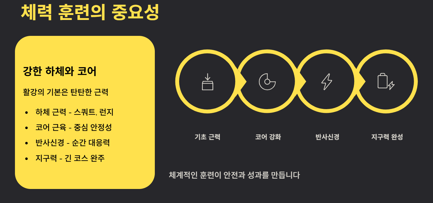 하체 근력과 코어 근육이 중요하며 반사신경 훈련과 지구력 훈련이 병행되어야 합니다.