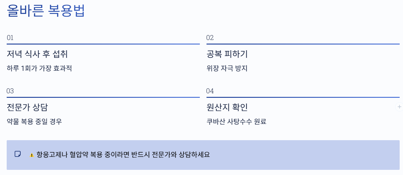 - 개인에 따라 위장 자극이 있을 수 있으므로 공복 섭취는 피하세요.
