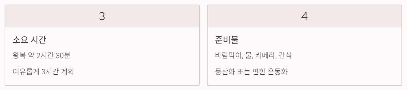 - 추천 준비물: 따뜻한 바람막이, 물, 카메라, 간식