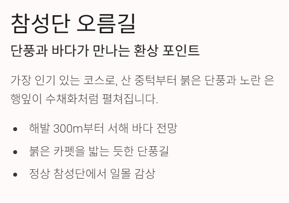 - ✅ 단풍 스팟: 참성단 오름길 / 단풍나무 군락지 / 동문 코스