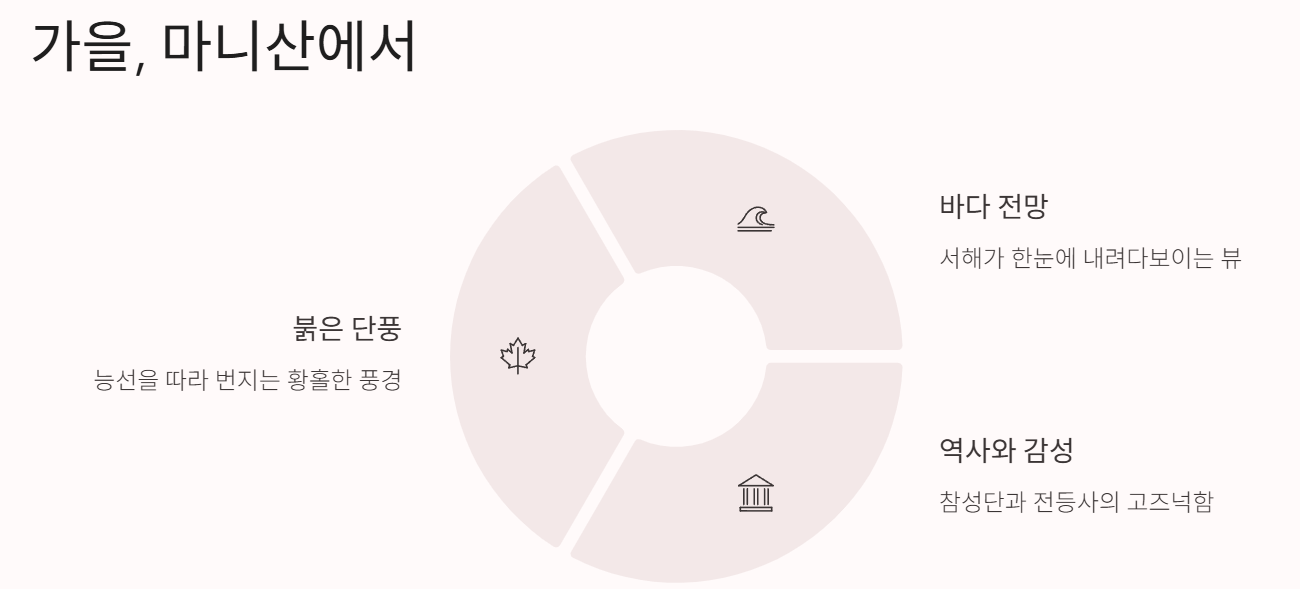 마니산은 높지 않지만 붉은 단풍, 바다 전망, 고즈넉한 산사 분위기까지 모두 갖춘 가을 명산입니다. 참성단의 장엄한 뷰, 단풍나무 군락지의 포토존, 동문 코스의 고요한 숲길 각기 다른 매력이 조화를 이루며 가을의 정취를 깊게 느낄 수 있습니다.