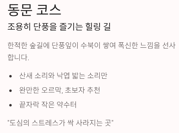 “사람이 많지 않아 조용히 단풍을 즐기기 좋았어요. 산새 소리와 낙엽 밟는 소리만 들리는 숲길이라 도심의 스트레스가 싹 사라졌어요. 단풍길 끝에는 작은 약수터가 있어서 물맛도 참 좋았습니다.”