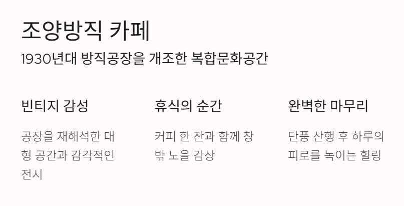 단풍 산행 후에는 조양방직 카페에서 여유를 즐겨보세요. 1930년대 방직공장을 개조해 만든 대형 복합문화공간으로, 빈티지한 인테리어와 감각적인 전시가 인상적입니다. 커피 한 잔을 마시며 창밖의 노을을 바라보면 하루의 피로가 사르르 녹아요.