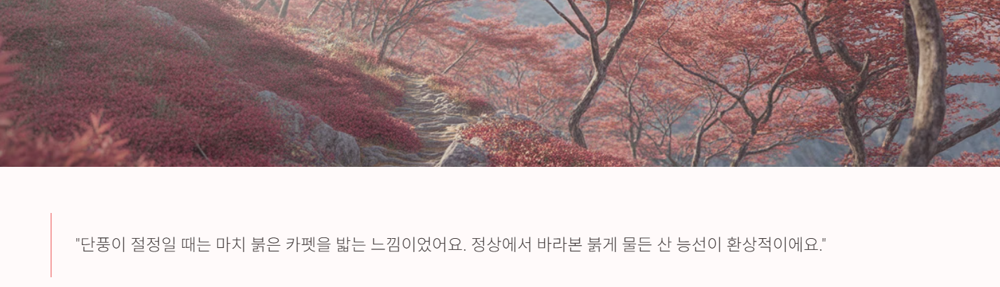 “단풍이 절정일 때는 마치 붉은 카펫을 밟는 느낌이었어요. 힘들지만 정상에서 참성단을 바라보며 붉게 물든 산 능선을 보는 순간, 왜 사람들이 이 계절에 꼭 마니산을 찾는지 알겠더라고요.”